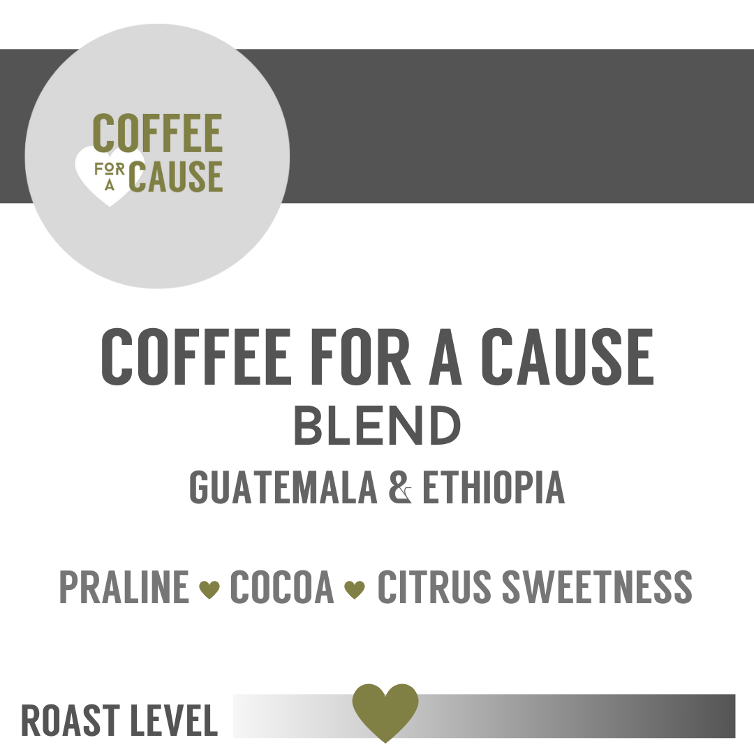 Coffee for a Cause is a simple, drinkable, and well-balanced blend of washed coffees from Guatemala and Ethiopia. It is equally delightful with cream or without, in the morning or the afternoon. Enjoy the notes of praline and cocoa powder, gentle citrus-like sweetness, and the delicious feeling of knowing you've helped make a difference.