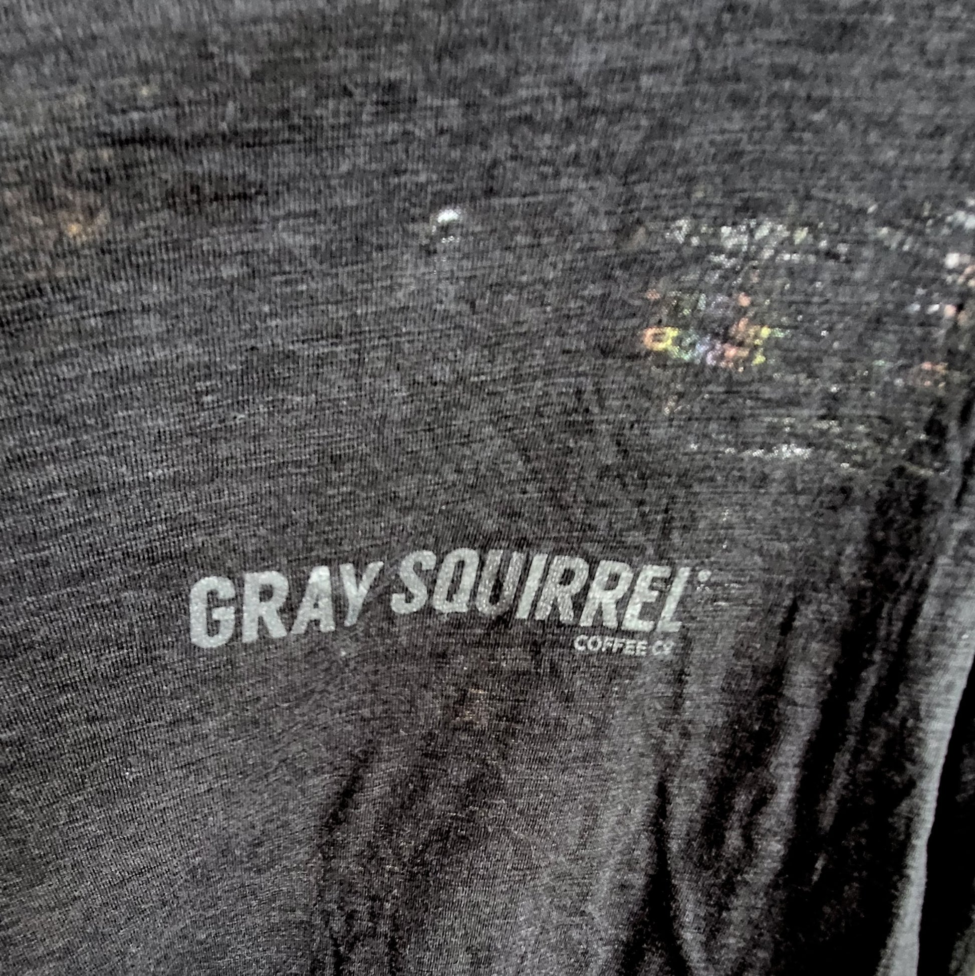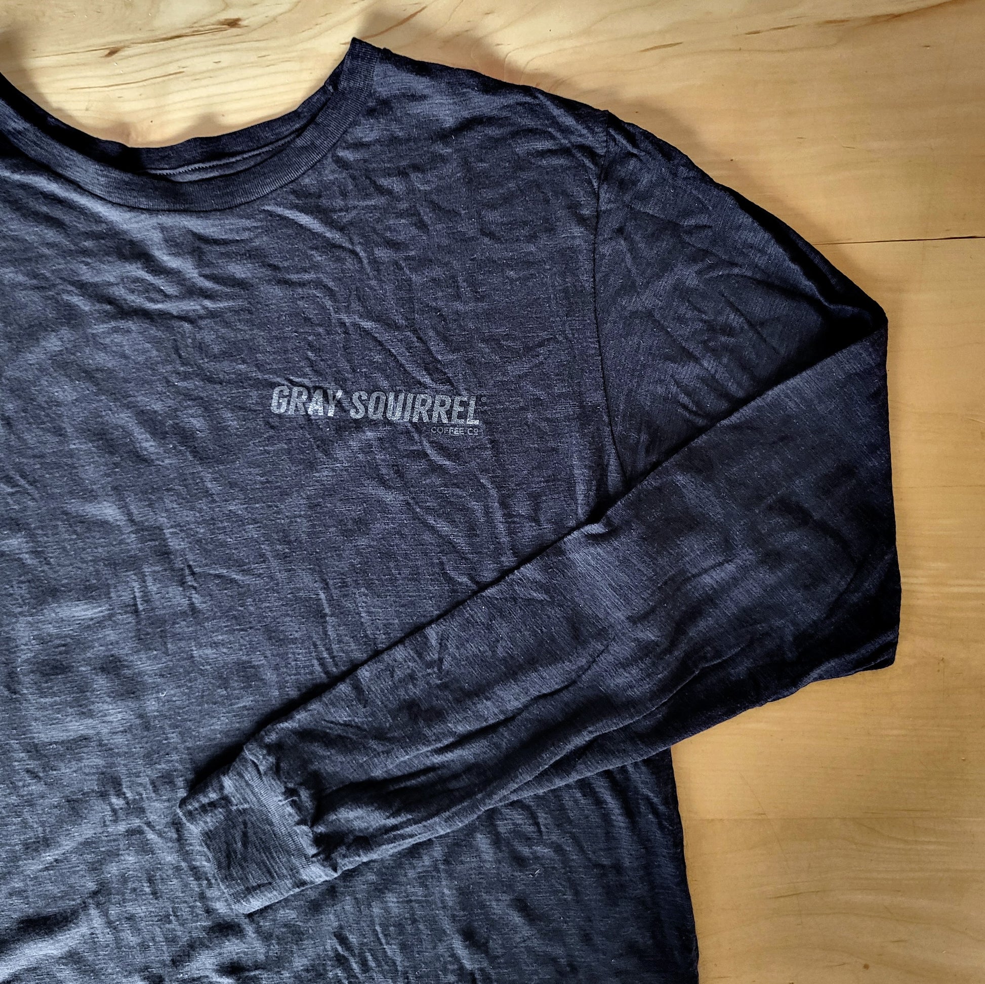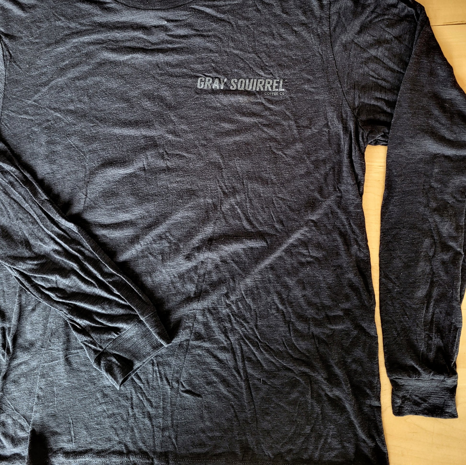 Here's a cool weather essential to add to your coffee shop collection. Our black long sleeve jersey tee features a classic crew neck and ultra-soft polyester/cotton/rayon tri-blend fabric that fits like an old friend. An open weave keeps it nice and breathable, even when layered under, say, your Gray Squirrel hoodie. Our name on the front, our logo on the back, you on the inside.